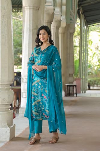 Anni Designer Women'S Cotton Blend Straight Printed Kurta With Pant & Dupatta (Geto Rama_L_Light Blue_Large),Light Blue,L,Cotton Blend,GETO RAMA-456,Kurta, Scarf