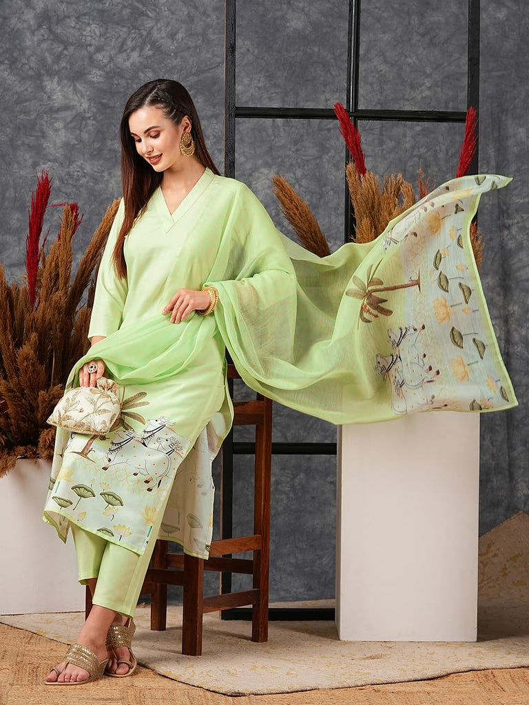Anni Designer Women'S Cotton Blend Straight Printed Kurta With Pant & Dupatta (Gosala Pista-Nw_L_Pista_Large)