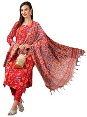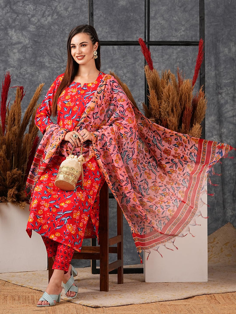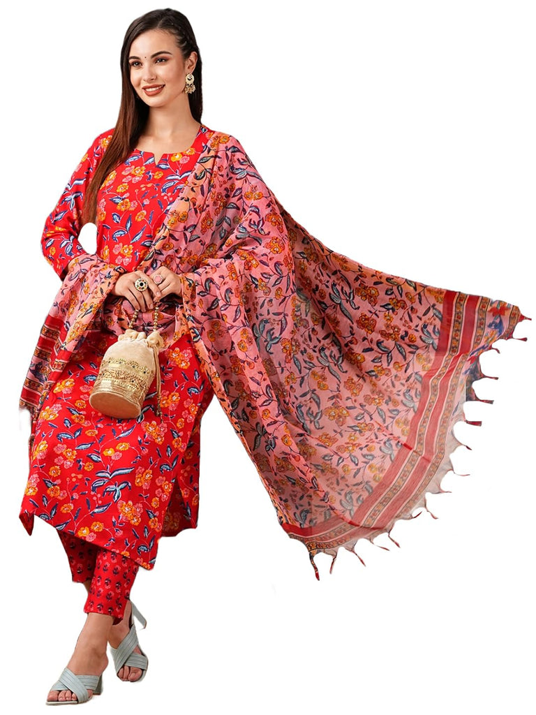 Anni Designer Women'S Cotton Blend Straight Printed Kurta With Pant & Dupatta (Ja Gadi Red-Ns_M_Red_Medium)