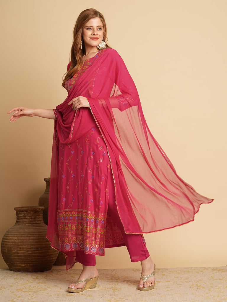 Anni Designer Women'S Cotton Blend Straight Printed Kurta With Pant & Dupatta (Kamita Pink-Nw_L_Pink_Large)