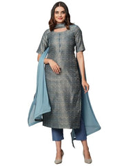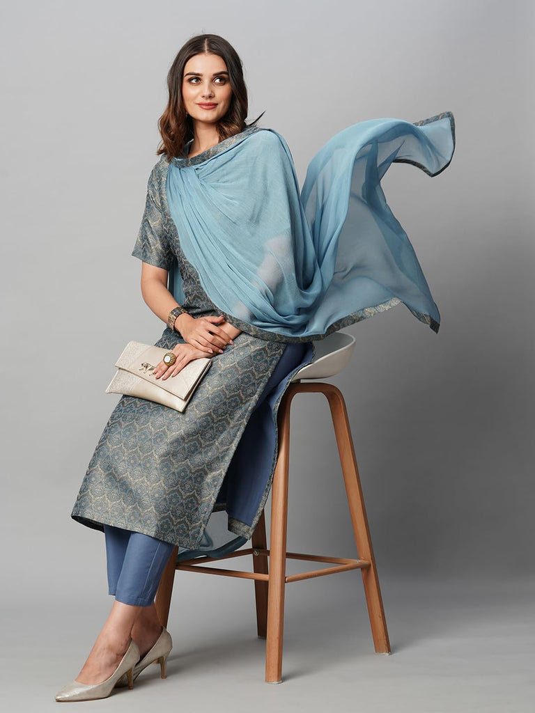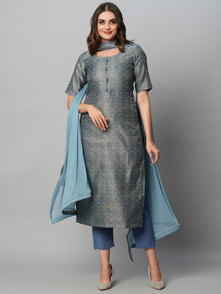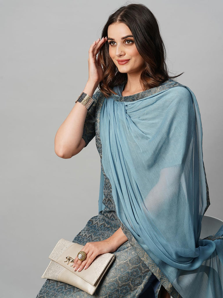 Anni Designer Women'S Cotton Blend Straight Printed Kurta With Pant & Dupatta (Luis Firoji_L_Blue_Large)