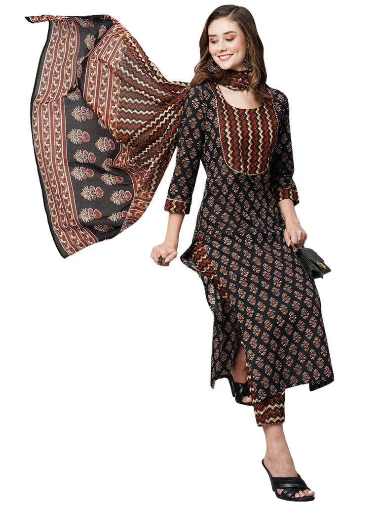 Anni Designer Women'S Cotton Blend Straight Printed Kurta With Pant & Dupatta (Manita Black_S_Black_Small),Black,S,Cotton Blend,Regular,Kurta, Pant & Dupatta