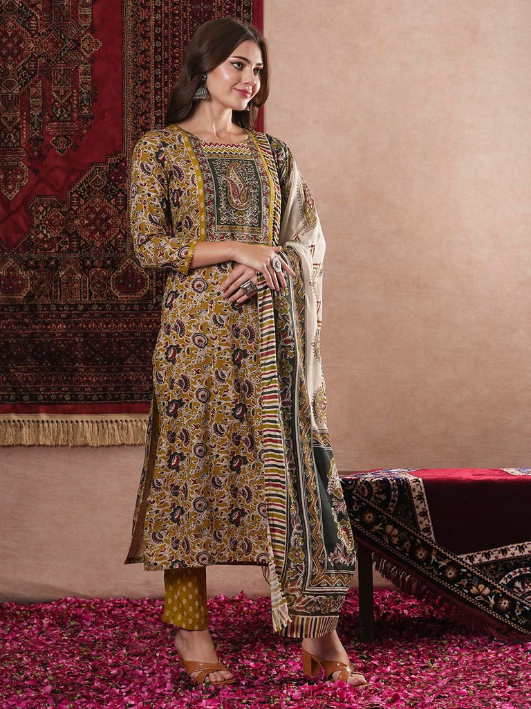 Anni Designer Women'S Cotton Blend Straight Printed Kurta With Pant & Dupatta (Mridul Mustard_L_Mustard_Large)