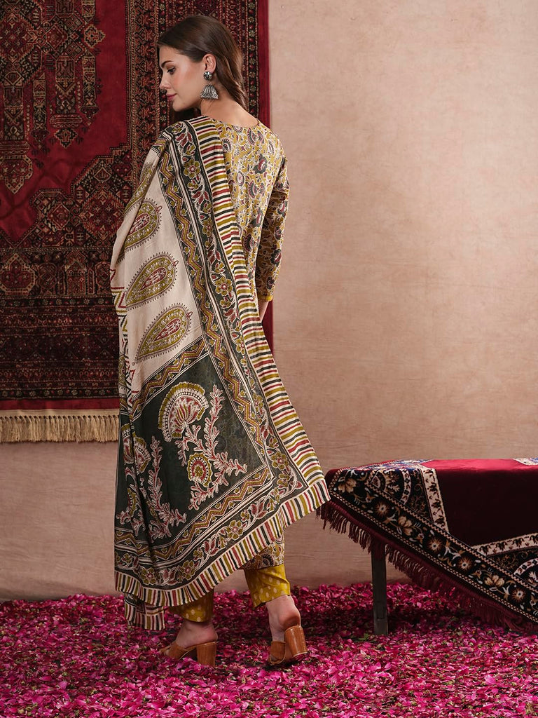 Anni Designer Women'S Cotton Blend Straight Printed Kurta With Pant & Dupatta (Mridul Mustard_Xxl_Mustard_Xx-Large),Mustard,2XL,,,