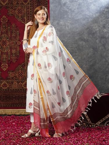 Anni Designer Women'S Cotton Blend Straight Printed Kurta With Pant & Dupatta (Nairiti White-Jl_Xxl_White_Xx-Large),White,2XL,Cotton Blend,Regular,Kurta, Scarf