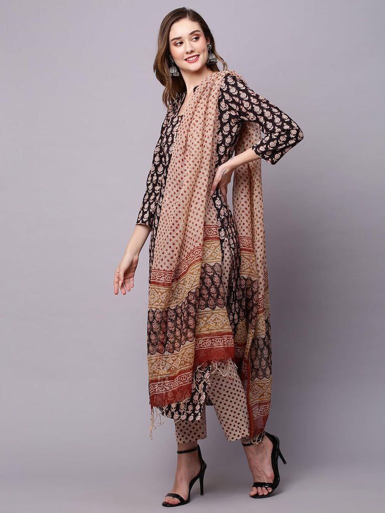 Anni Designer Women'S Cotton Blend Straight Printed Kurta With Pant & Dupatta (Nayantara Black_L_Black_Large),Black,L,Cotton Blend,Regular,