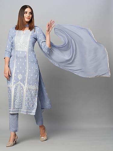 Anni Designer Women'S Cotton Blend Straight Printed Kurta With Pant & Dupatta (Paridhan Grey_3Xl_Grey_Xxx-Large)