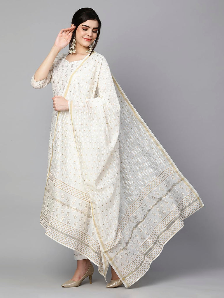 Anni Designer Women'S Cotton Blend Straight Printed Kurta With Pant & Dupatta (Saligram Cream_L_Cream_Large)