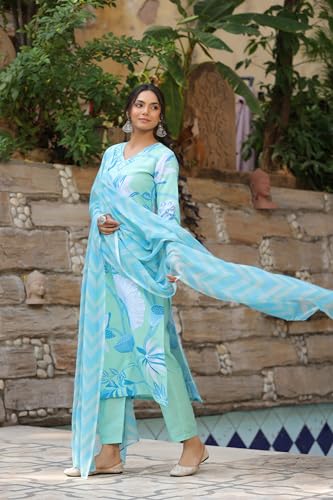 Anni Designer Women'S Cotton Blend Straight Printed Kurta With Pant & Dupatta (Sohini Blue-Nw_S_Blue_Small),Blue,S,Cotton Blend,Regular,