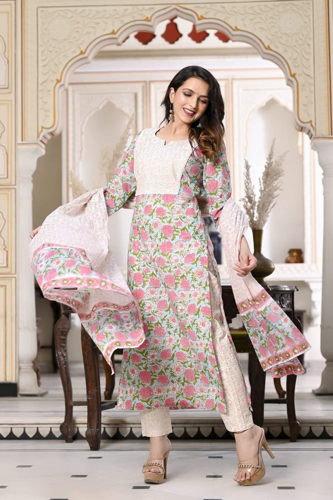 Anni Designer Women'S Cotton Blend Straight Printed Kurta With Pant & Dupatta (Spring Green-Snw_M_Green_Medium),Green,M,Cotton Blend,Regular,Kurta, Scarf