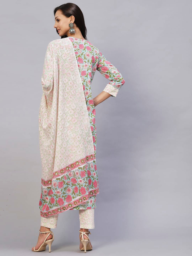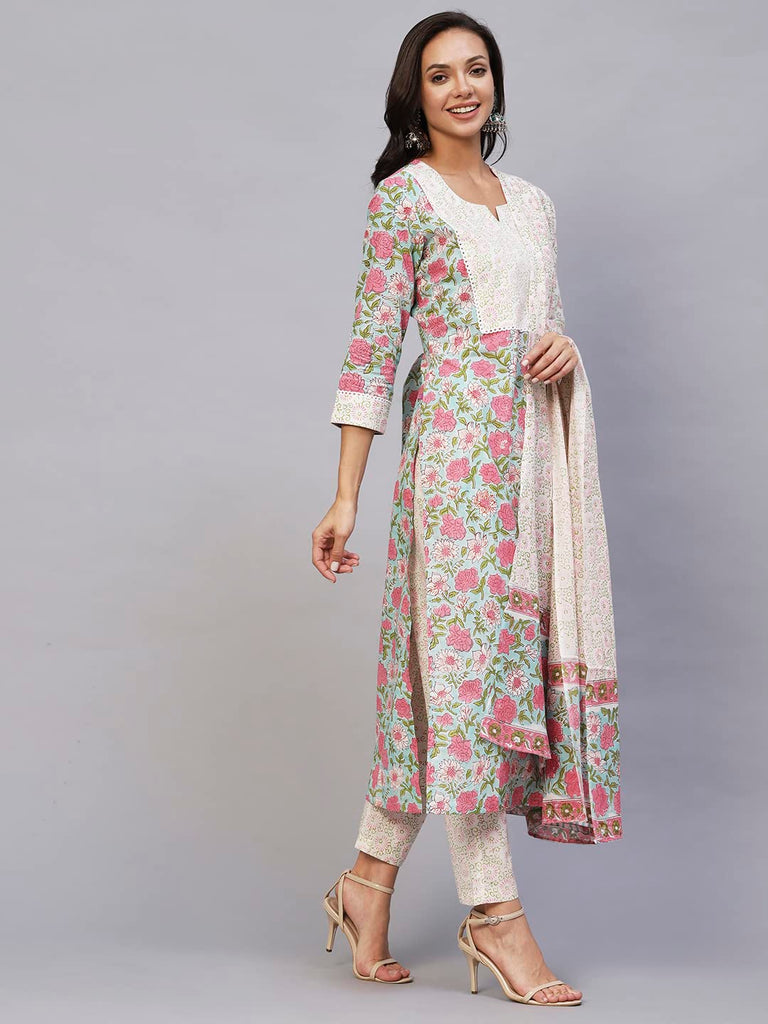 Descriptionanni Designer Women'S Cotton Blend Staright Printed Kurta With Pant & Dupatta (Spring Green_L_Green_Large)