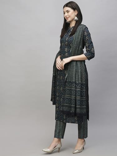 Descriptionanni Designer Women'S Cotton Blend Straight Printed Kurta With Pant & Dupatta (Vakula Green_M_Green_Medium)