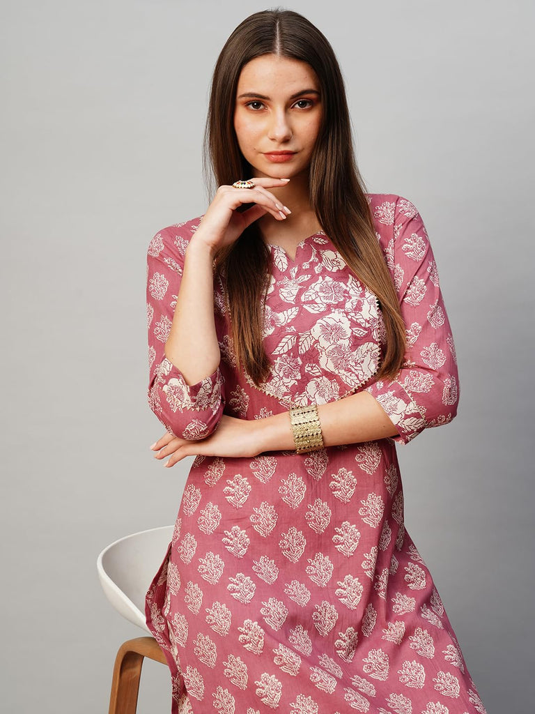 Yes, the kurta features a straight cut style with 3/4 sleeves and a crew neck, along with printed designs that add to its aesthetic appeal.