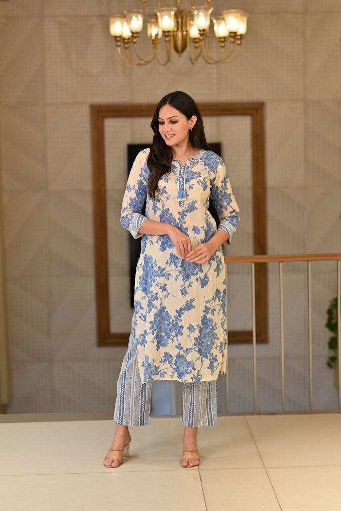 Anni Designer Women'S Cotton Blend Straight Printed Kurta With Pant (Jamahi Blue-Nw_L_Blue_Large)