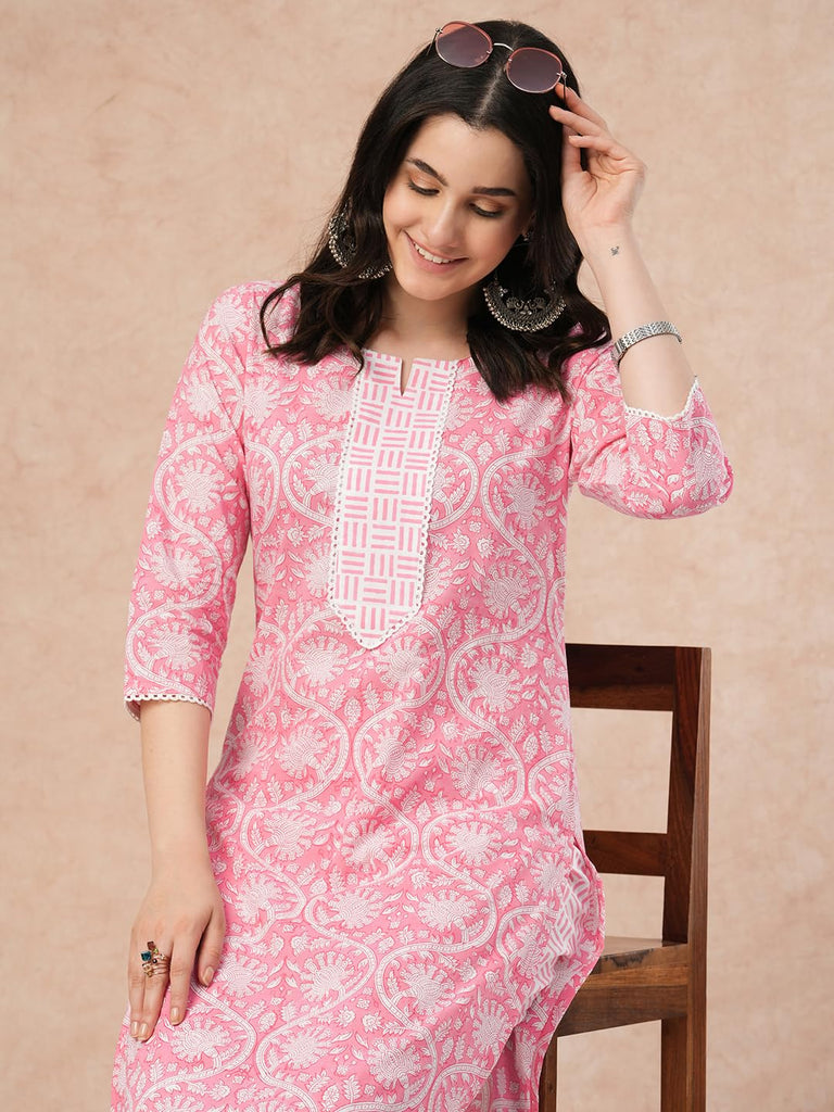Anni Designer Women'S Cotton Blend Straight Printed Kurta With Pant (Od18 Pink_S_Pink_Small)