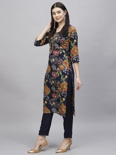 Anni Designer Women'S Cotton Blend Straight Printed Kurta With Pant (Paajas Navy Blue_Xxl_Navy Blue_Xx-Large),Navy Blue,2XL,Cotton Blend,Straight,Kurta