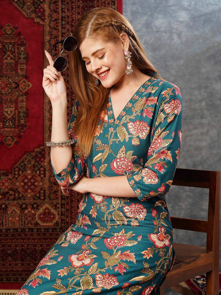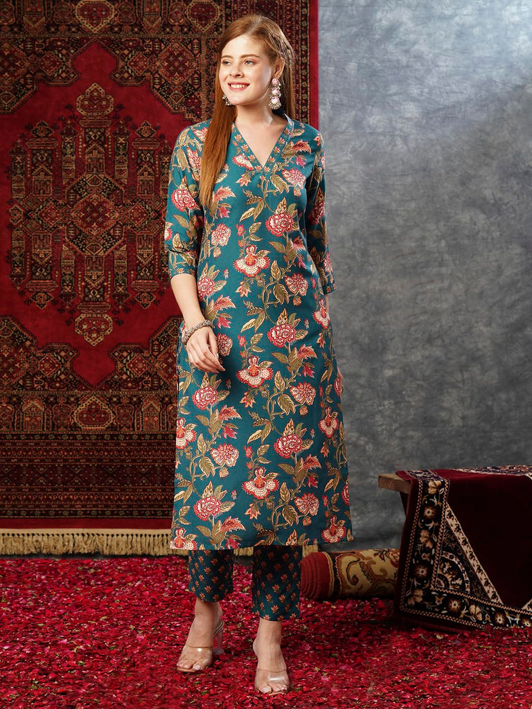 Anni Designer Women'S Cotton Blend Straight Printed Kurta With Pant (Paresh Rama_L_Green_Large)