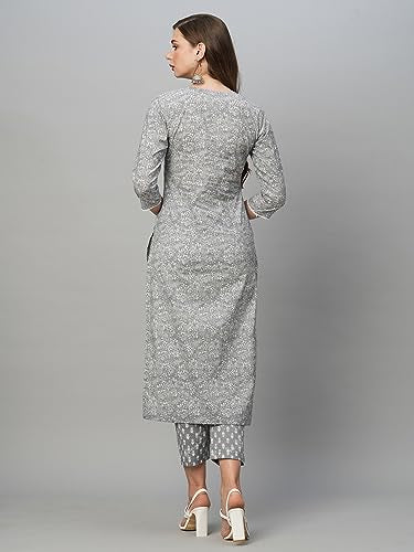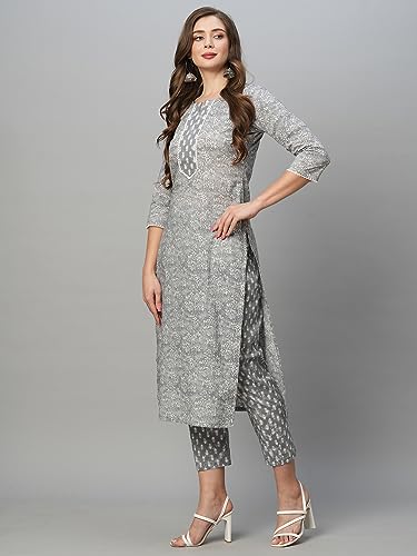 Anni Designer Women'S Cotton Blend Straight Printed Kurta With Pant Set (Srinath-Grey-Nw_Xl_Grey_X-Large),Grey,XL,Cotton Blend,Regular,Kurta
