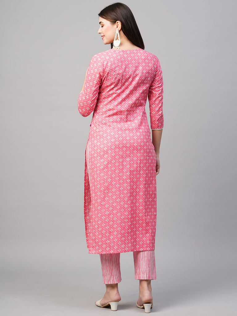Anni Designer Women'S Cotton Blend Straight Printed Kurta With Pant (Tai Pink_S_Pink_Small),Pink,S,Cotton Blend,Regular,Pants