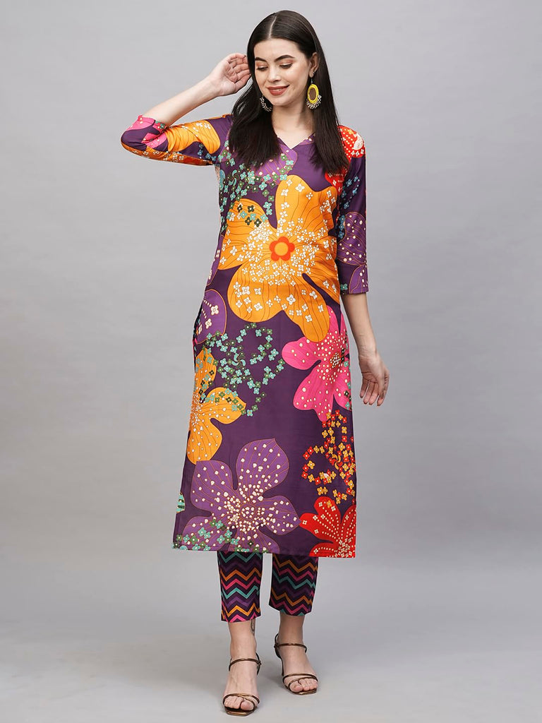 The kurta features a straight style with 3/4 sleeves and a crew neck design.