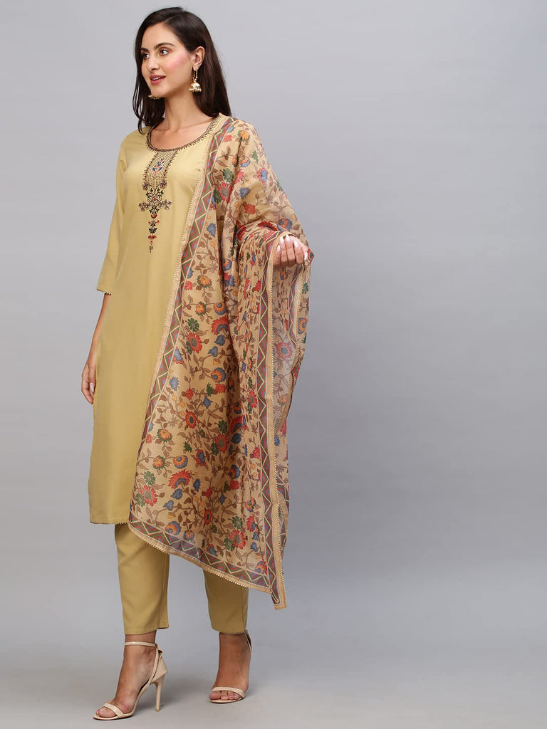 Anni Designer Women'S Cotton Blend Straight Solid Kurta With Pant & Dupatta (Shiva Beige-Jan18_3Xl_Beige_Xxx-Large),Beige,3XL,Cotton Blend,Regular,Dupatta