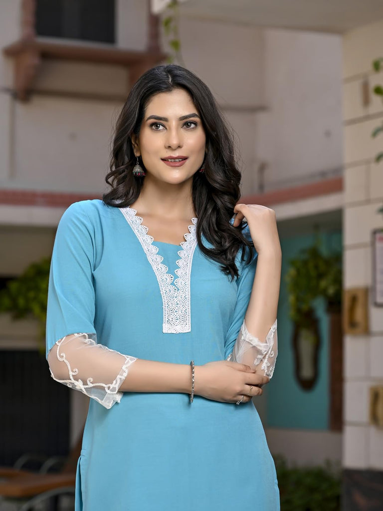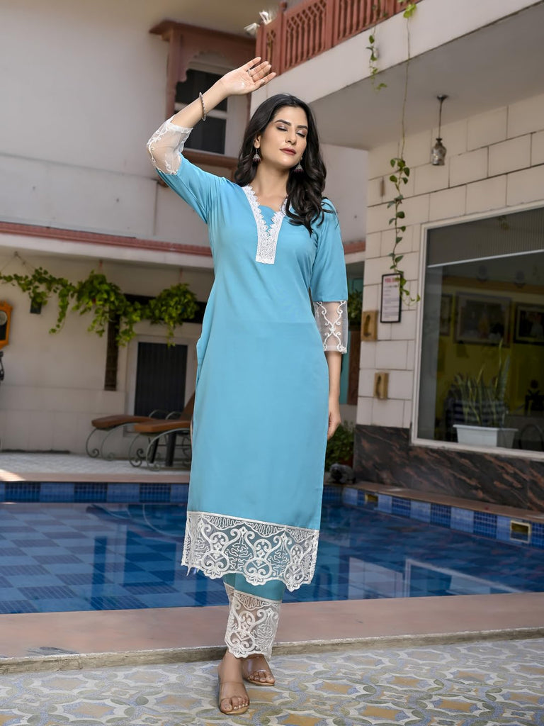 Anni Designer Women'S Cotton Blend Straight Solid Kurta With Pant (Takada Sky Blue-Nw_S_Sky Blue_Small)