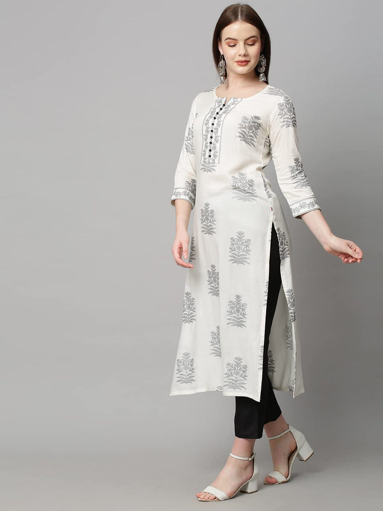 Anni Designer Women'S Cotton Blend Traditional Straight Printed Kurta And Pant Set (12 Amd White_S_White_Small),White,S,Cotton Blend,Regular,Pants
