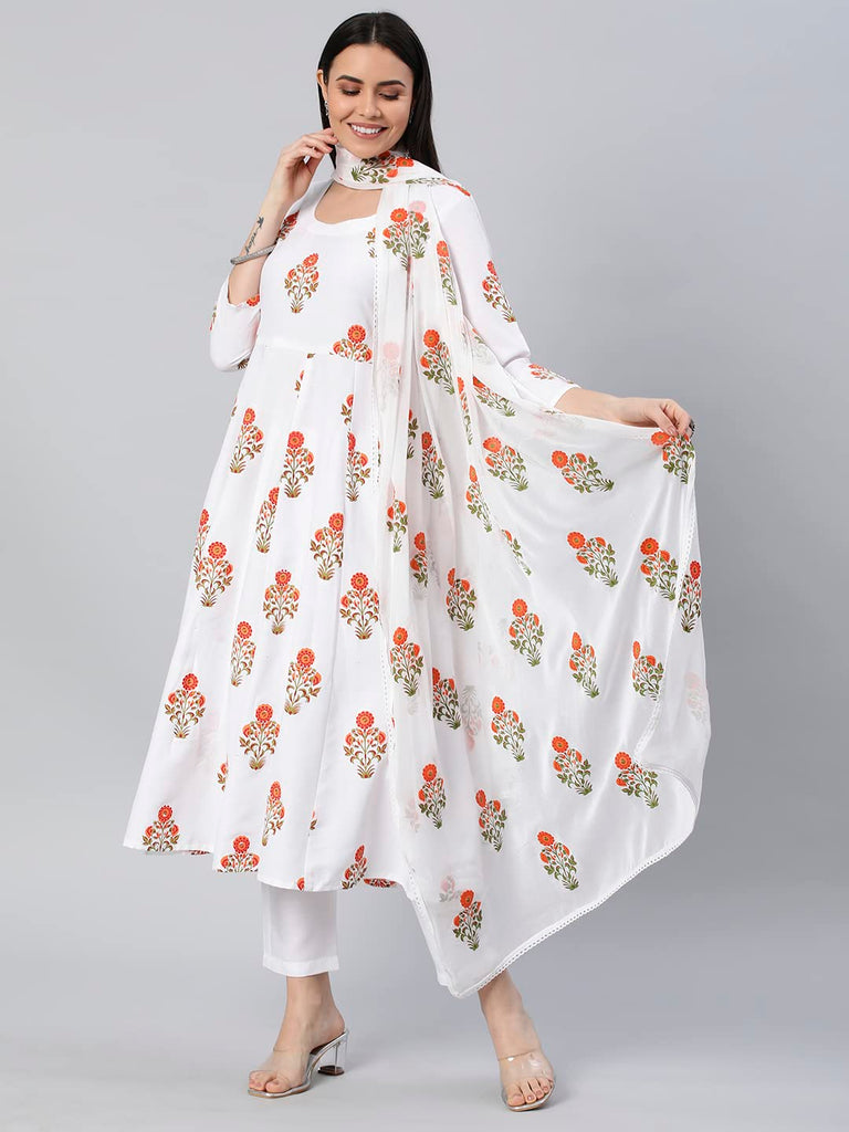 Anni Designer Women'S Georgette Anarkali Floral Printed Kurta With Pant & Dupatta (Clean-White_S_White_Small),White,S,Georgette,Anarkali,Dupatta