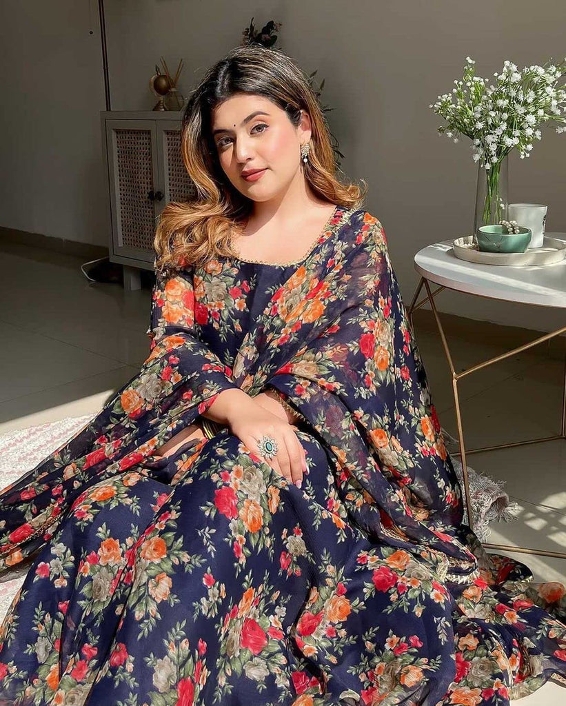 The ANNI DESIGNER Georgette Anarkali Kurta Set is made from georgette fabric, which is known for its lightweight and flowy characteristics.