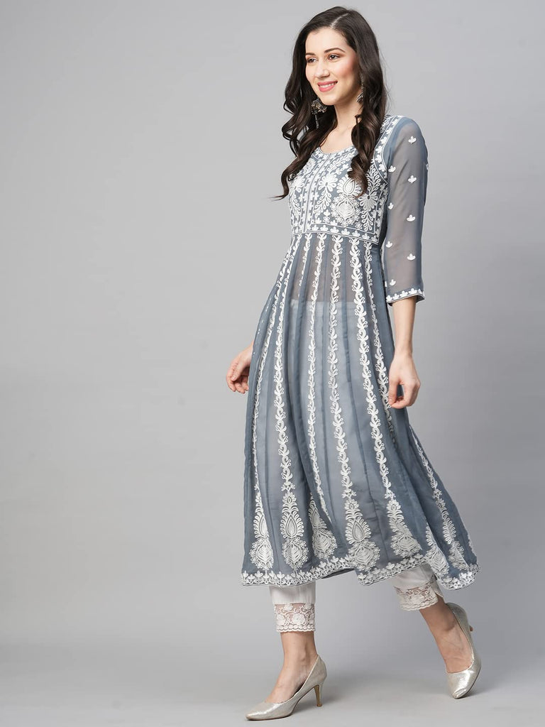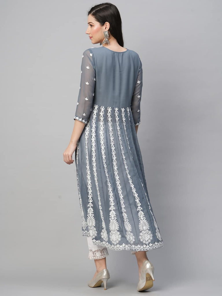 Anni Designer Women'S Georgette Chikankari Embroidered Anarkali Kurti (Kari Grey_Xl_Dark Grey_X-Large),Grey,XL,Georgette,Anarkali,