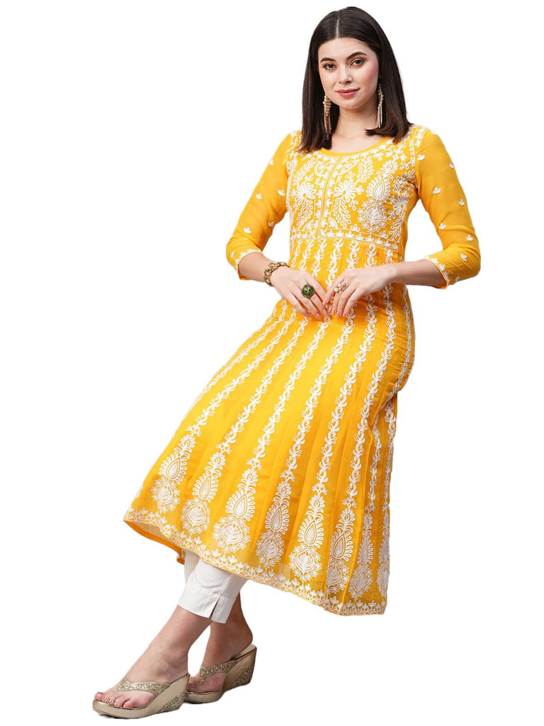 Descriptionanni Designer Women'S Georgette Chikankari Embroidered Anarkali Kurti (Naav Yellow-Nw2_M_Yellow_Medium)