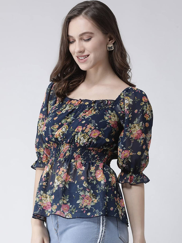 Anni Designer Women'S Georgette Floral Printed Puff Sleeves Square Neck Top (Bfc Blue_Xl_Blue_X-Large),Blue,XL,Georgette,Western,