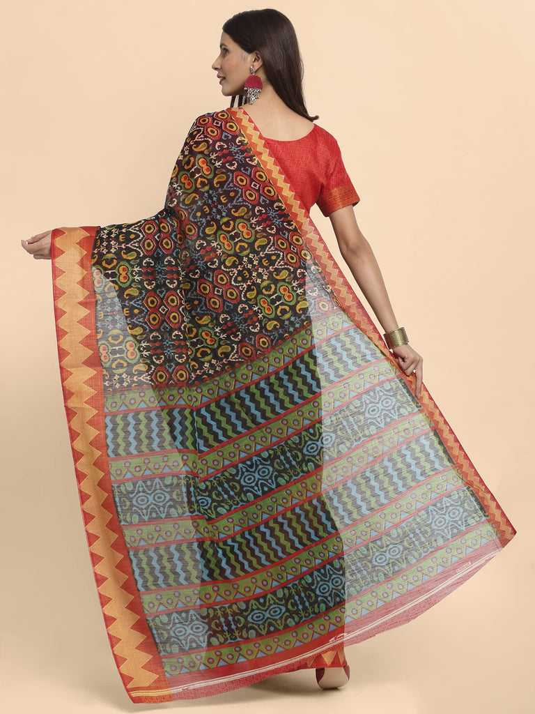 Anni Designer Women'S Linen Cotton Printed Saree With Blouse Piece (Srisha Black_Black),Black,Free,Linen Cotton,Printed,With Blouse Piece