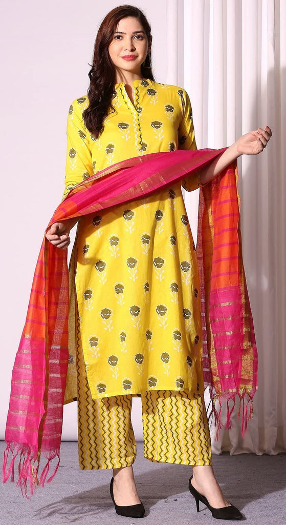 Anni Designer Women'S Pure Cotton Straight Kurta With Palazzo & Dupatta (Kpzd-Cot-10002-Yellow_Xl_Yellow_X-Large),Yellow,XL,Cotton Blend,Straight,Dupatta, Palazzo