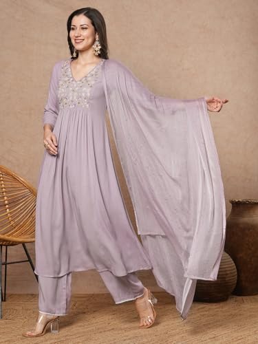Anni Designer Women'S Rayon Blend A-Line Embroidered Kurta With Pant & Dupatta (Sharmi Lavender-Vks01_L_Lavender_Large),Lavender,L,Rayon Blend,Classic,