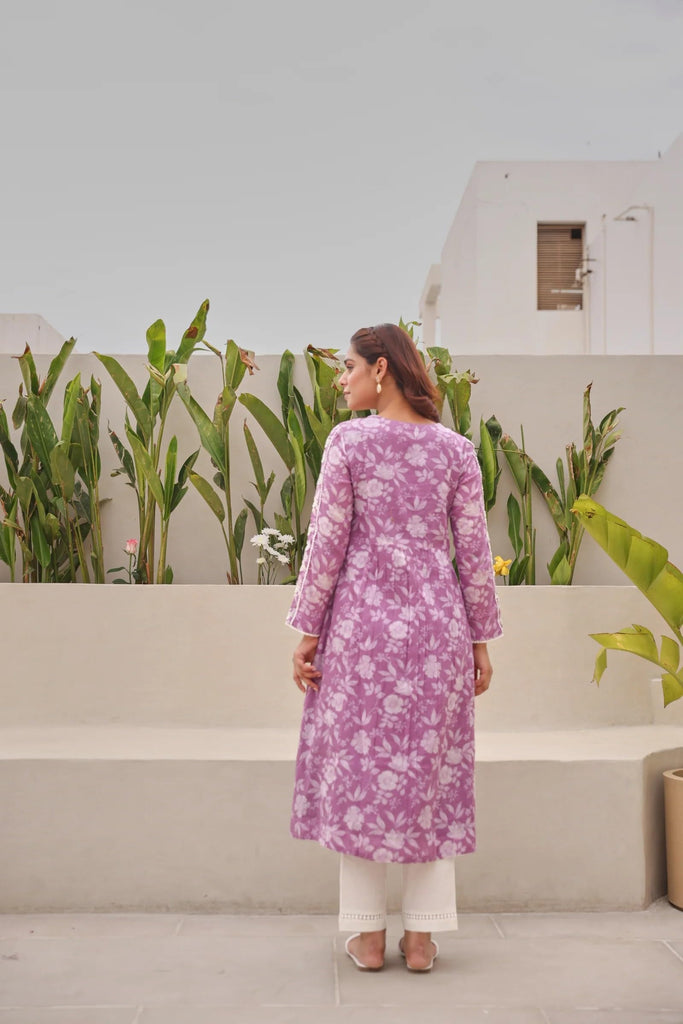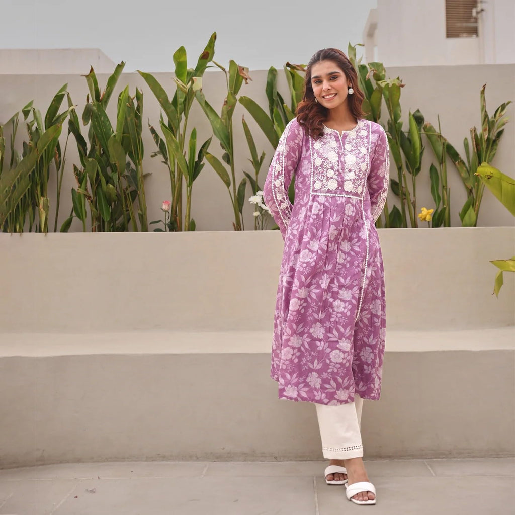 This kurta features an Anarkali style and has a calf-length design, providing a traditional yet elegant look.