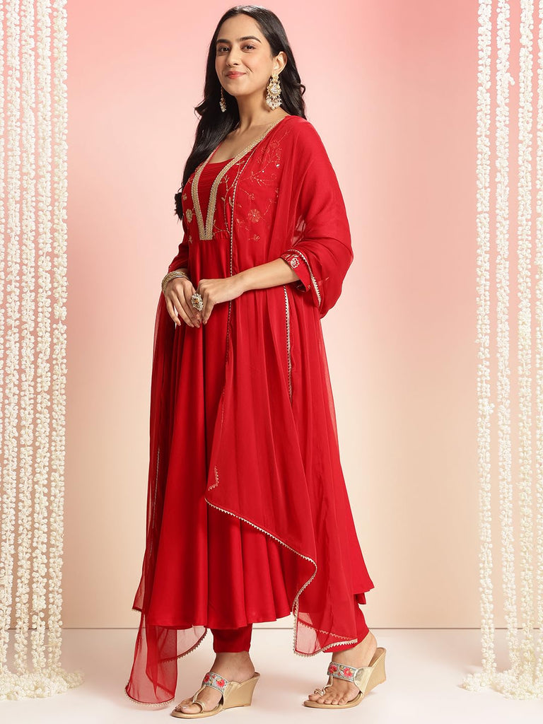 Anni Designer Women'S Rayon Blend Anarkali Embroidered Kurta With Pant & Dupatta (Bobheli Red_L_Red_Large),Red,L,Rayon Viscose,Anarkali,