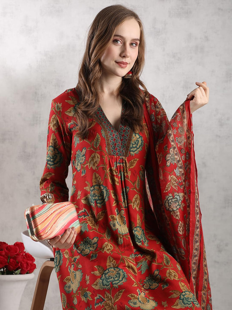 Anni Designer Women'S Rayon Blend Anarkali Printed Kurta With Palazzo & Dupatta (Cia Red-Vks06_Xxl_Red_Xx-Large),Red,2XL,,,