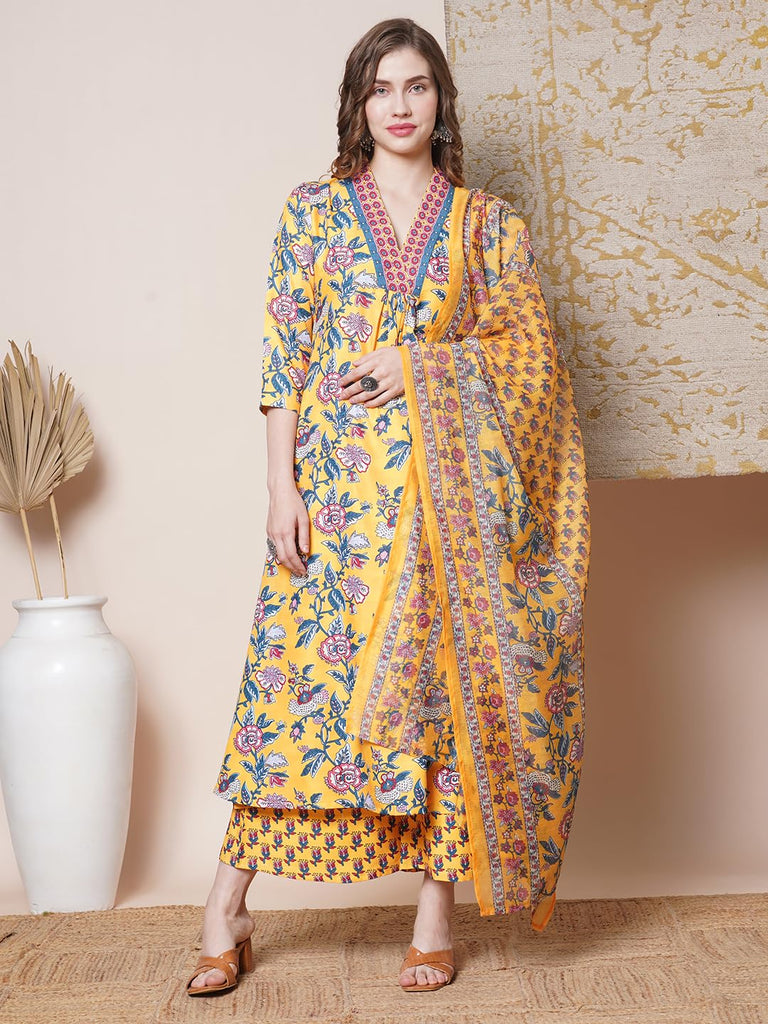 Anni Designer Women'S Rayon Blend Anarkali Printed Kurta With Palazzo & Dupatta (Cia Yellow-Vks03_L_Yellow_Large)