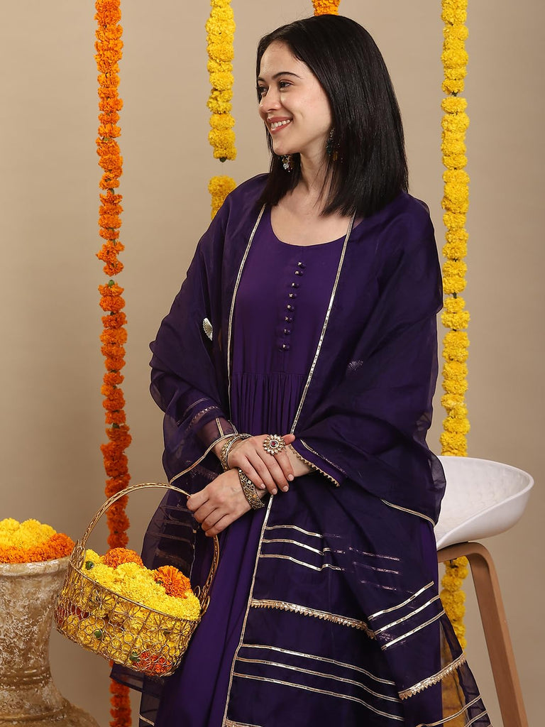 Anni Designer Women'S Rayon Blend Anarkali Solid Kurta With Pant & Dupatta (Jaynti Begani-Vks03_M_Begani_Medium),Begani,M,,,