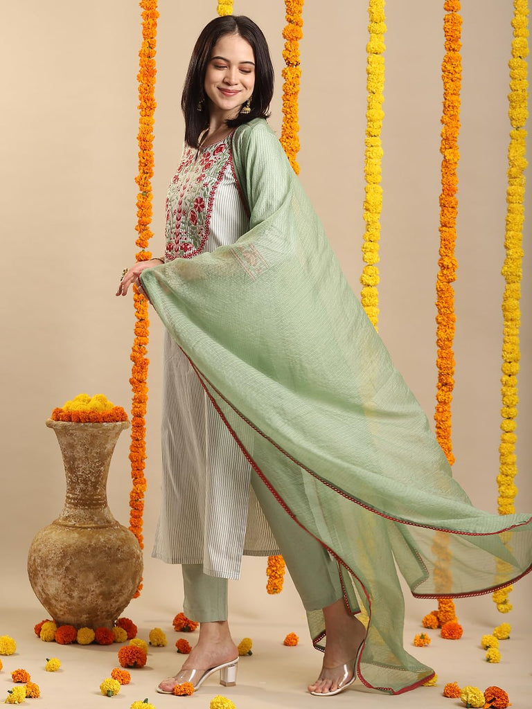 Anni Designer Women'S Rayon Blend Embroidered Straight Kurta With Pant & Dupatta (Farigup-Green-Vks01_Xl_Green_X-Large)