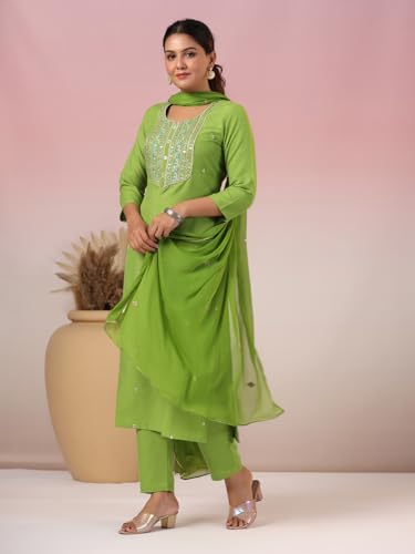 Anni Designer Women'S Rayon Blend Embroidered Straight Kurta With Pant & Dupatta (Kasturi Parrot_Xxl_Parrot Green_Xx-Large),Parrot Green,2XL,Rayon Blend,Regular,Dupatta