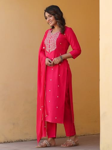 Descriptionanni Designer Women'S Rayon Blend Embroidered Straight Kurta With Pant & Dupatta (Kasturi Parrot_M_Parrot Green_Medium)