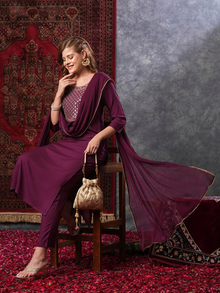 Anni Designer Women'S Rayon Blend Embroidered Straight Kurta With Pant & Dupatta (Yuvani Wine-Vks01_Xxl_Wine_Xx-Large)