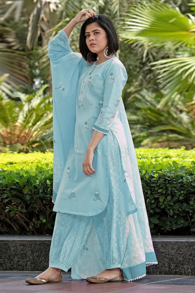 Anni Designer Women'S Rayon Blend Hand Block Printed Straight Kurta With Pant & Dupatta (Ragsri Ice Blue-Vks02_Xl_Sky Blue_X-Large)
