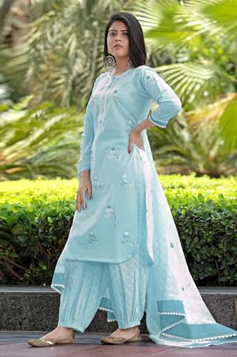 Anni Designer Women'S Rayon Blend Hand Block Printed Straight Kurta With Pant & Dupatta (Ragsri Ice Blue-Vks04_Xl_Sky Blue_X-Large),Blue,XL,Rayon Blend,Regular,Kurta, Scarf