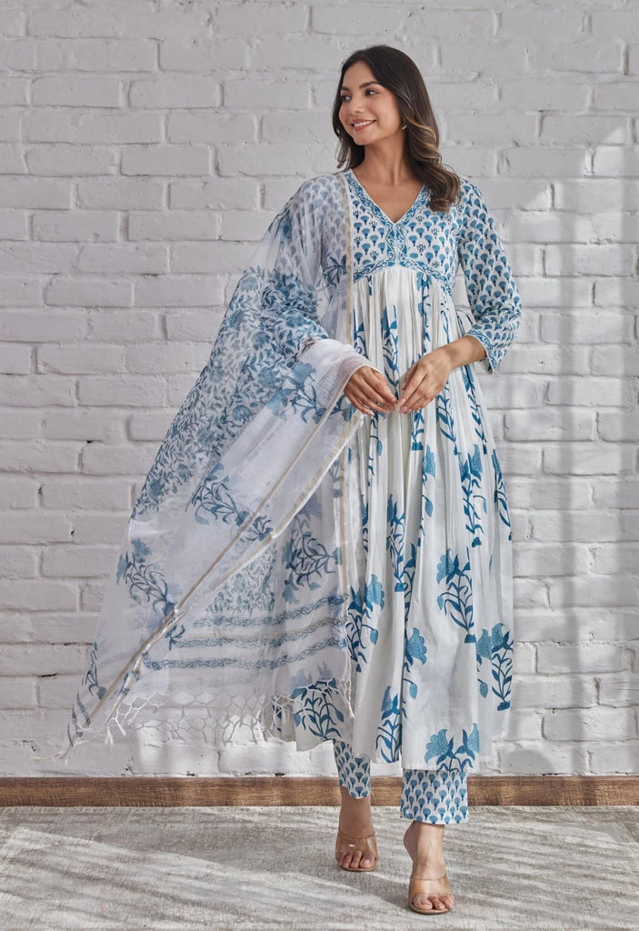 Anni Designer Women'S Rayon Blend Printed Anarkali Kurta With Pant & Dupatta (Betul White_Xxl_White_Xx-Large),White,2XL,Rayon Blend,Anarkali,