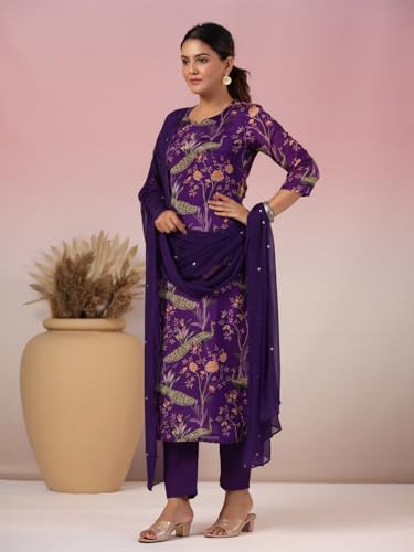 Anni Designer Women'S Rayon Blend Printed Straight Kurta With Pant & Dupatta (Geto Blue_Xl_Blue_X-Large),Violet,XL,Rayon Blend,Regular,Kurta, Scarf