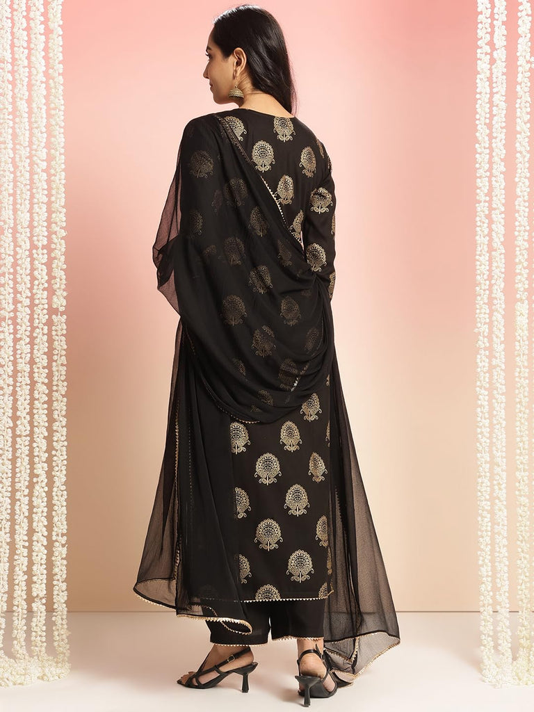 Anni Designer Women'S Rayon Blend Printed Straight Kurta With Pant & Dupatta (Jubal Black_L_Black_Large),Black,L,Rayon Blend,Classic,