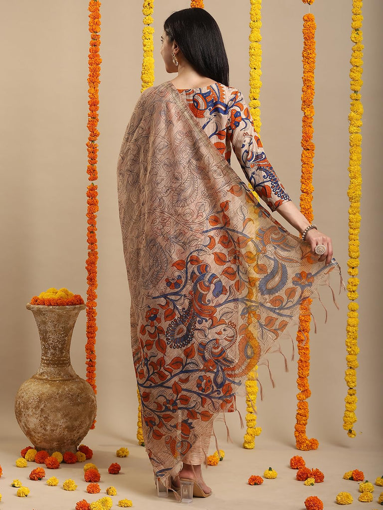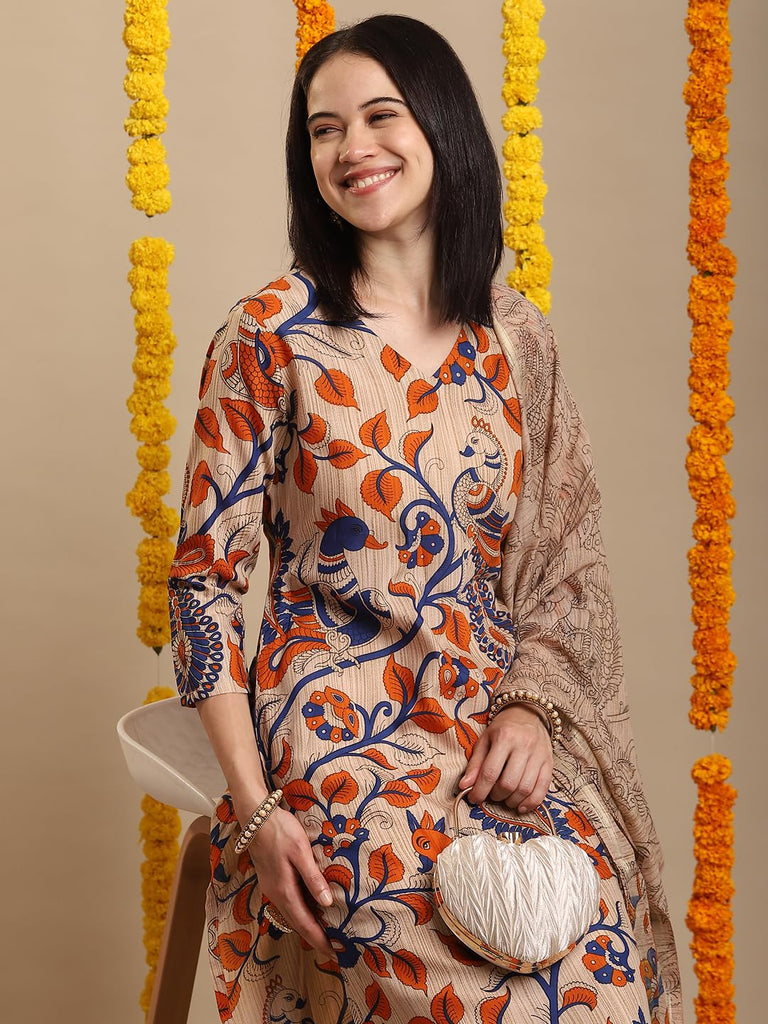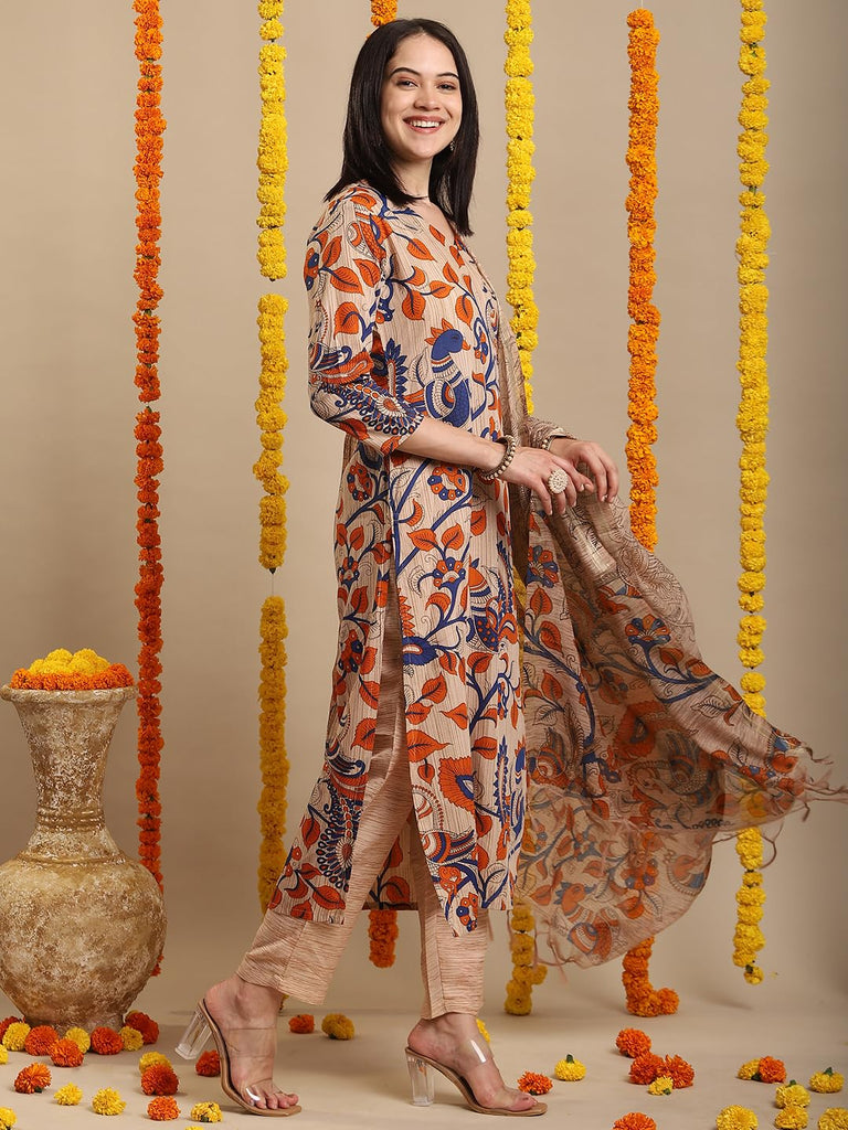 Anni Designer Women'S Rayon Blend Printed Straight Kurta With Pant & Dupatta (Kalam Chiku-Vks02_L_Beige_Large)